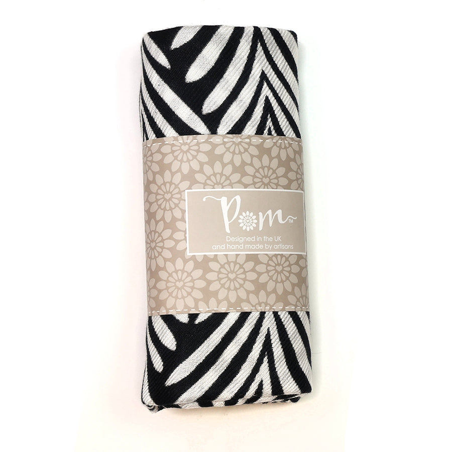 Black and white leaf repeat print bamboo scarf with olive green edges