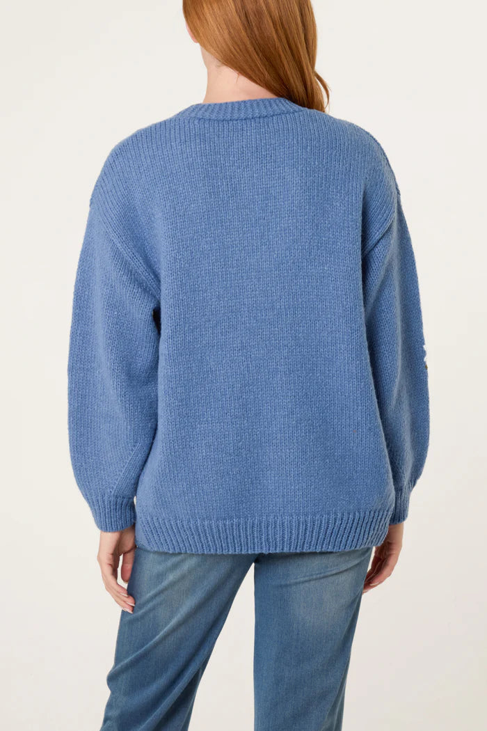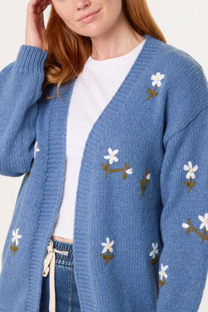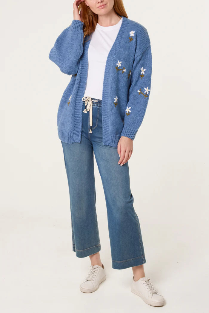 A beautifully crafted cardigan that brings together timeless style and delicate detail. This denim blue knit features hand-finished daisy embroidery across the front, adding a touch of artistry to a classic wardrobe staple.