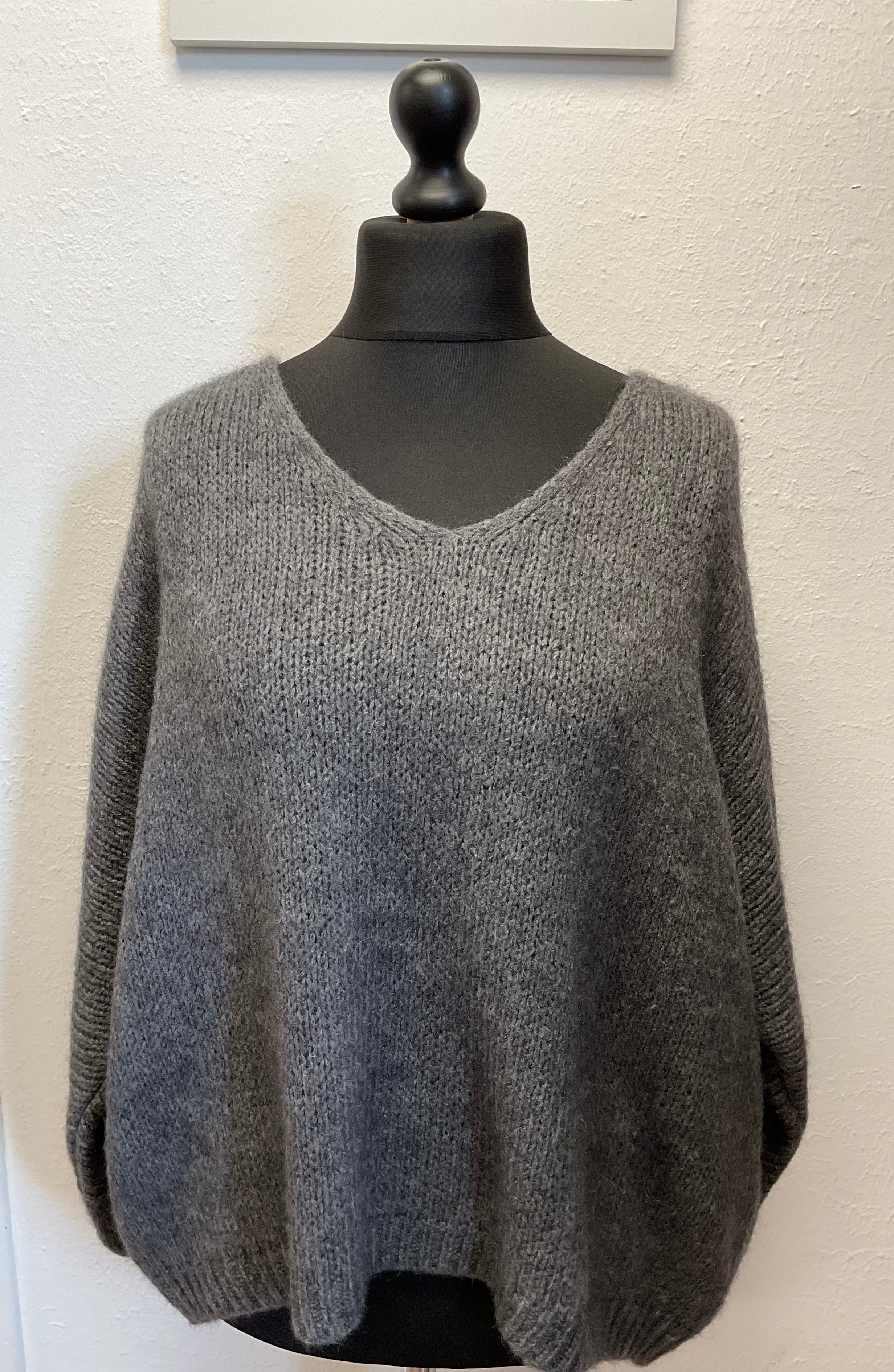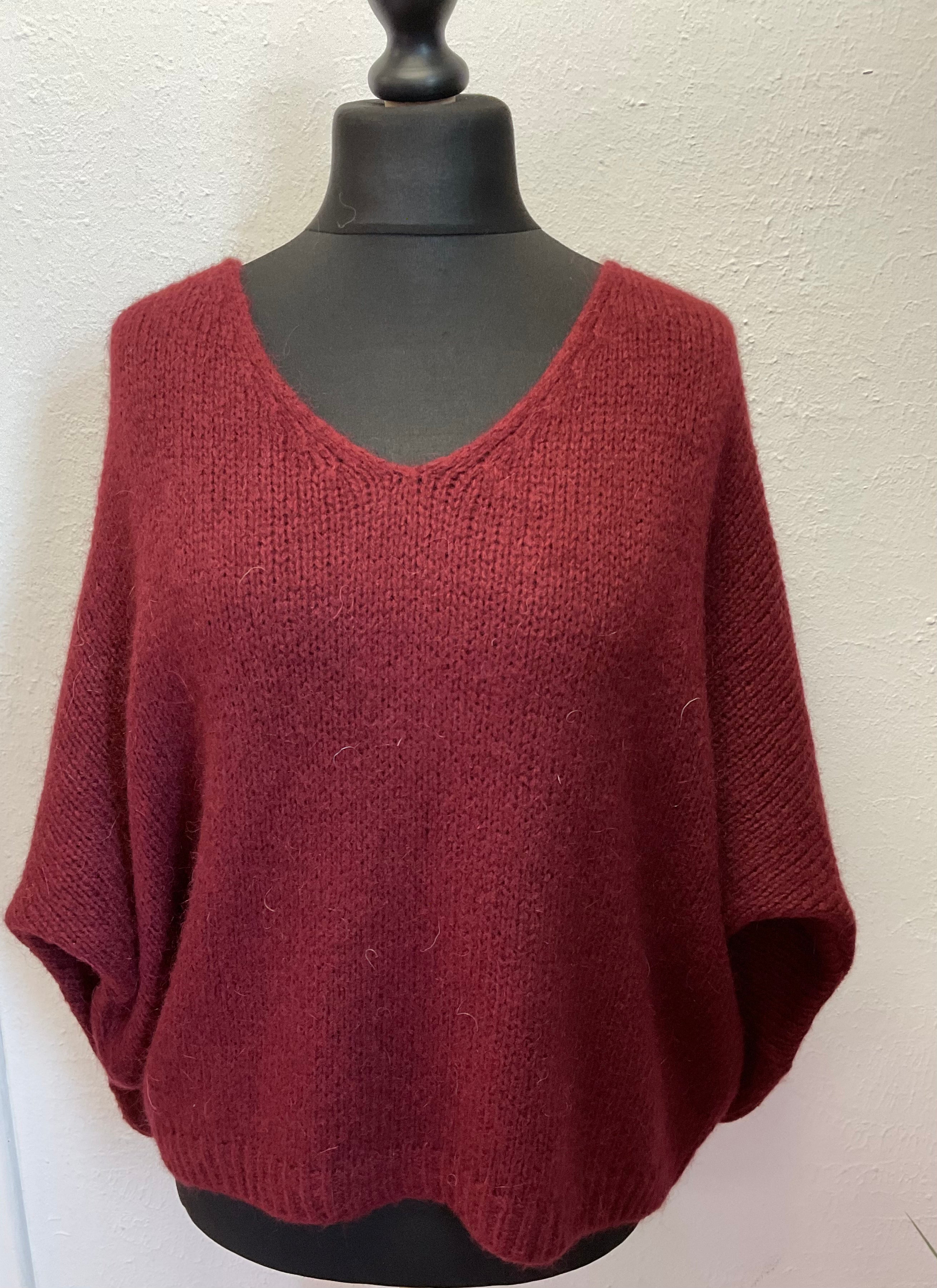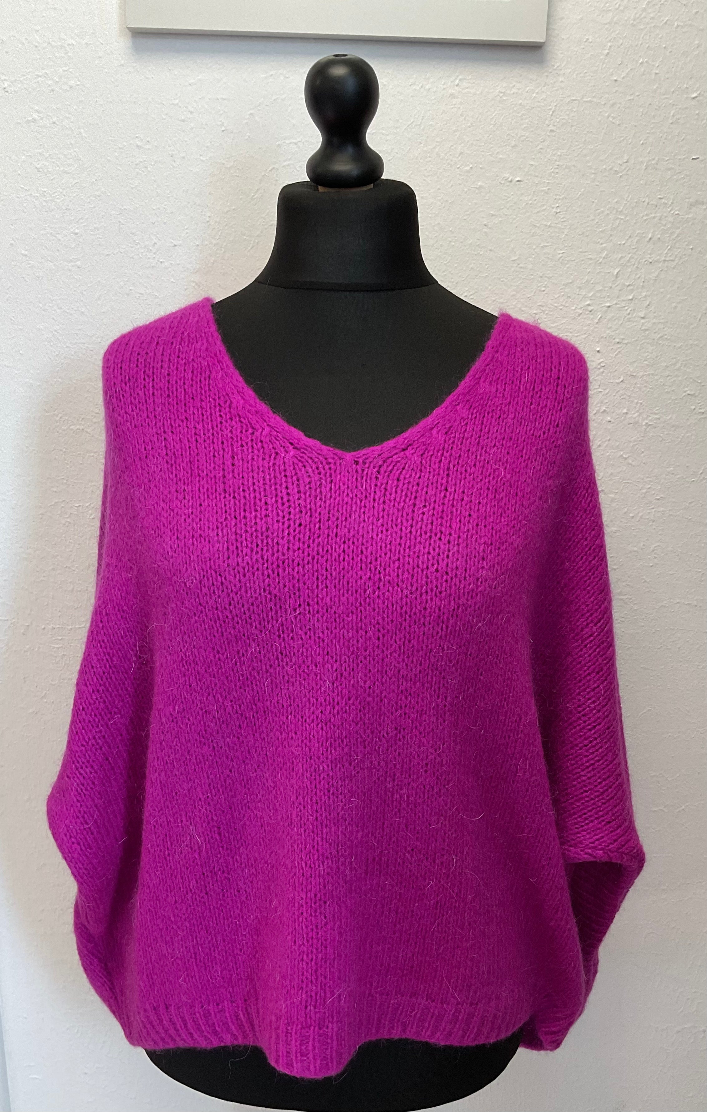 Fluffy mohair v-neck jumper with cropped sleeves, perfect for layering, available in a choice of colours. A great Autumn/Winter staple.