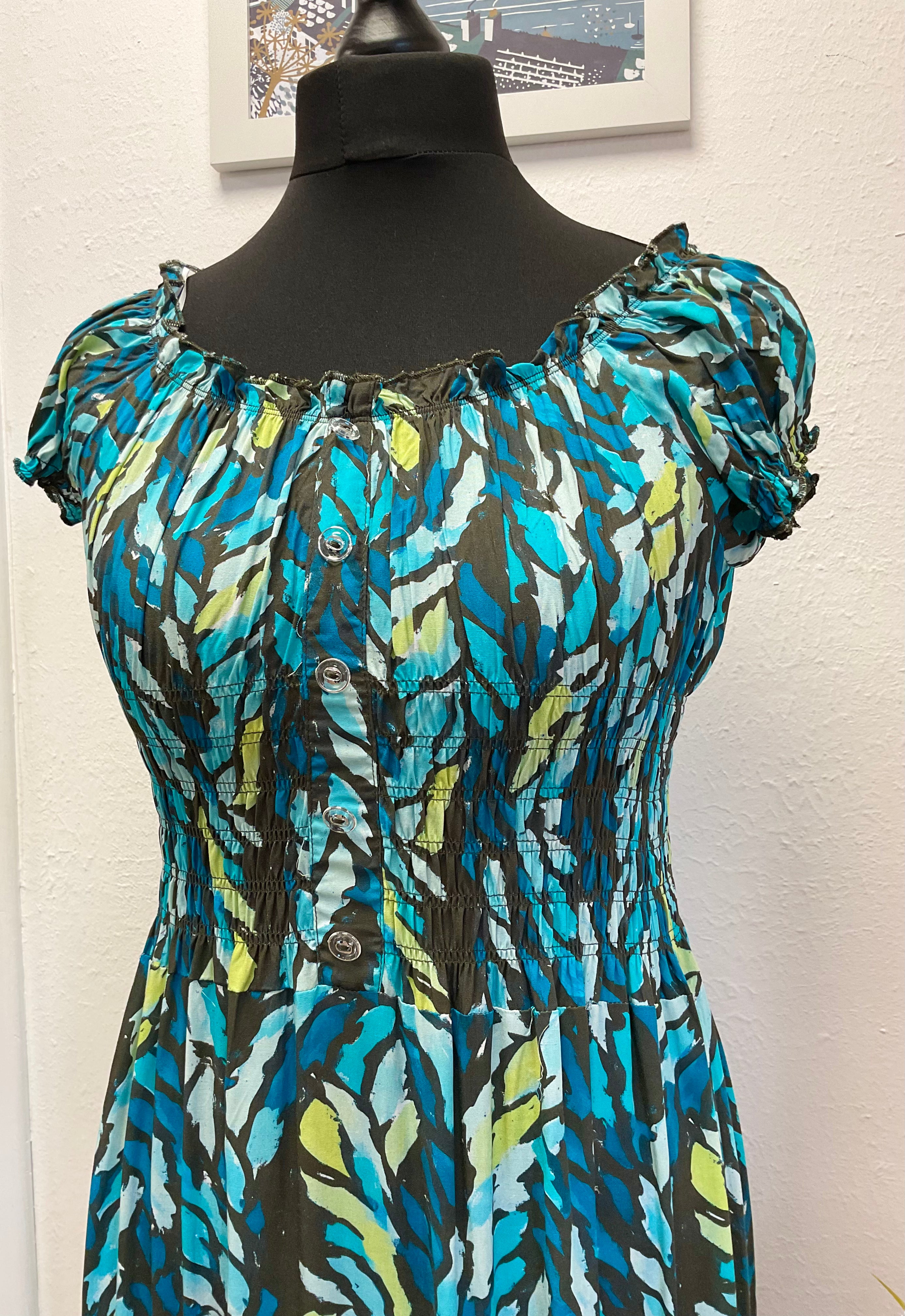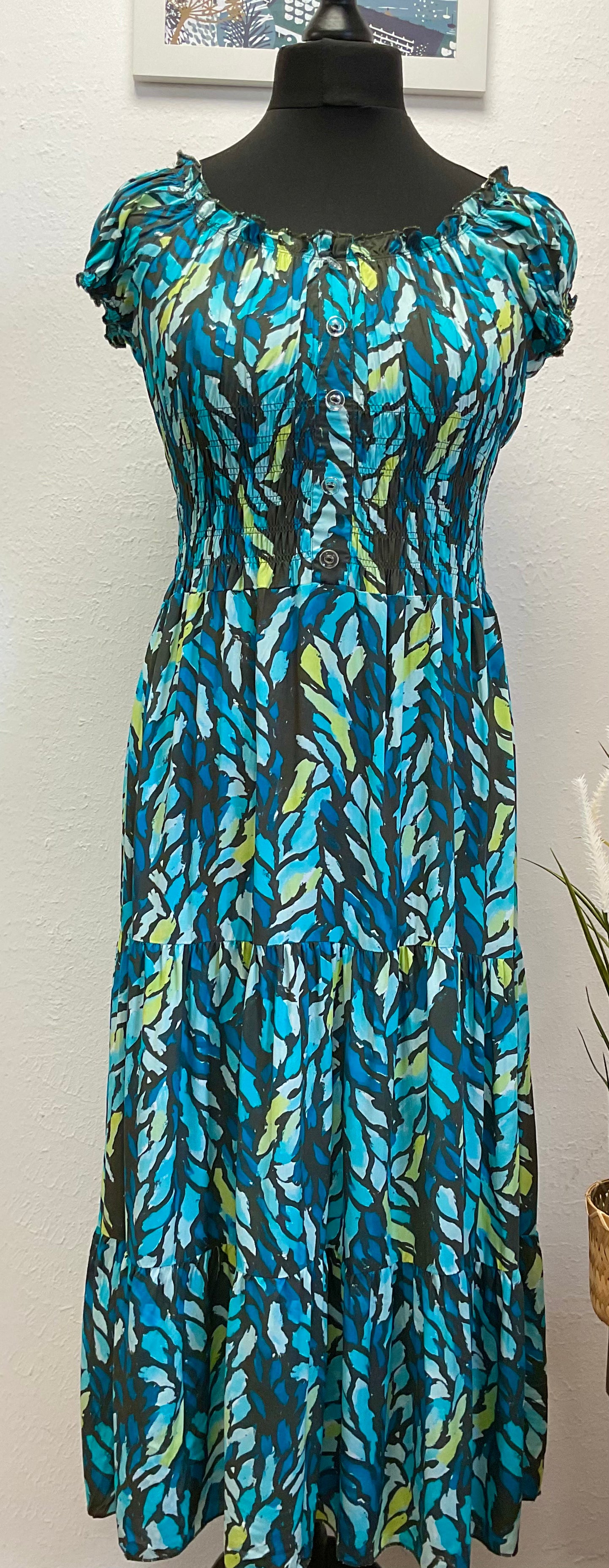 A pretty tiered dress with a shirred waist and teal blue pattern.