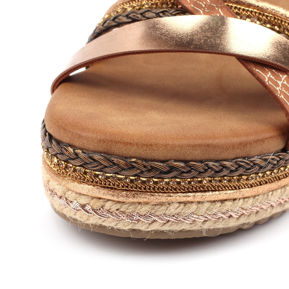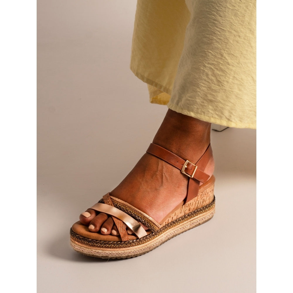 - Decoration: overlapping straps, metallic accents, and a cork style wedge