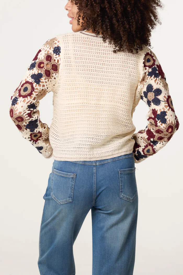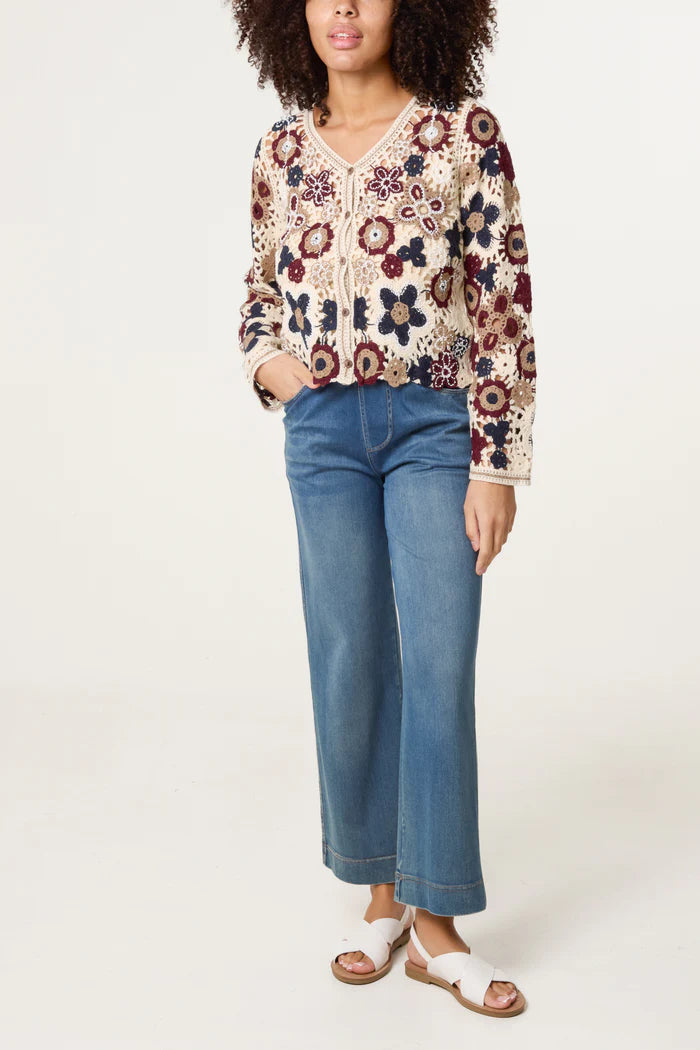 Delicate floral crochet work meets effortless sophistication in this beautifully crafted cardigan. The intricate openwork design creates a romantic, feminine silhouette whilst the relaxed V-neck ensures versatile, everyday wearability.