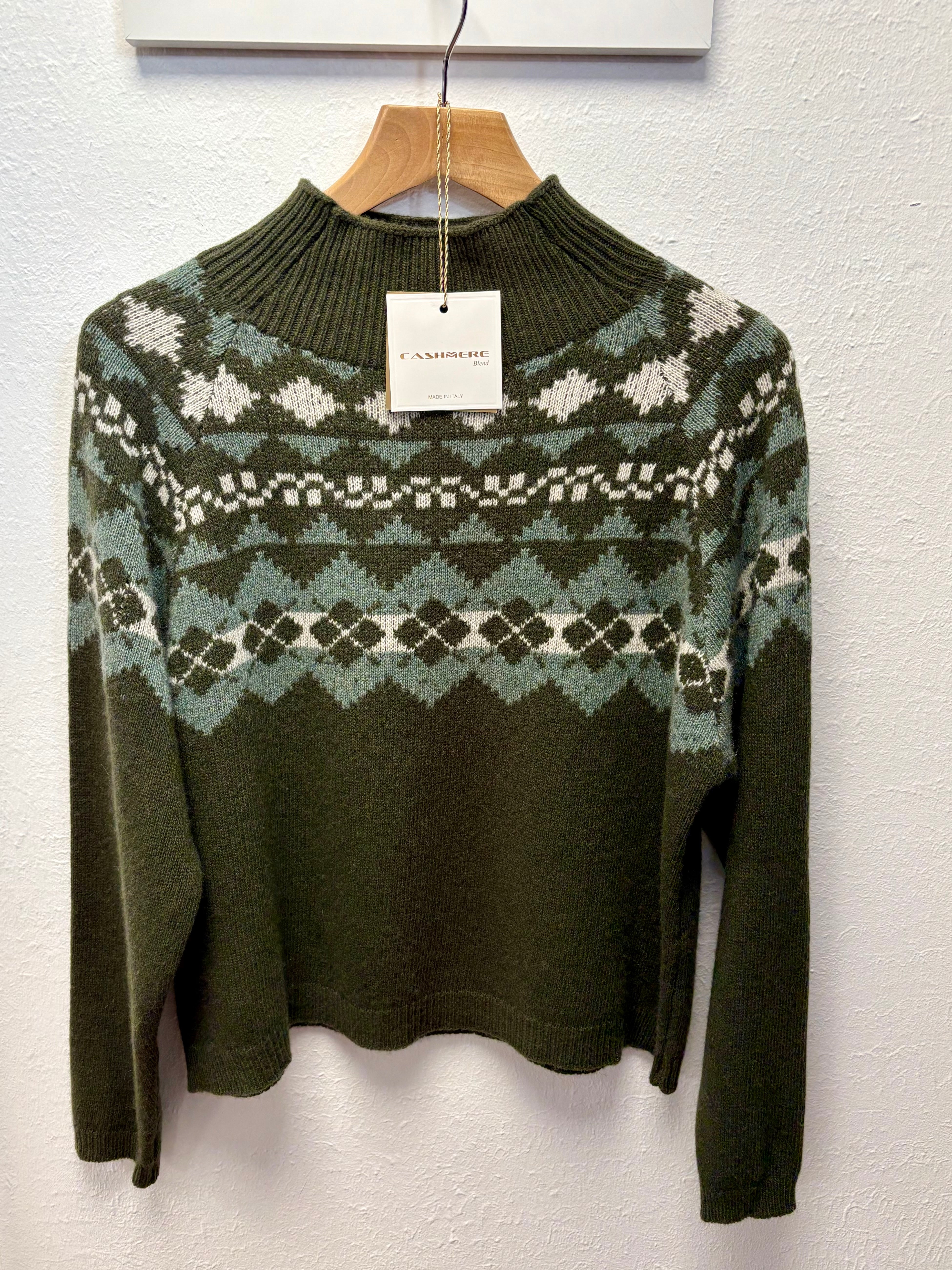 Embrace cosy elegance with this beautifully crafted Funnel Neck Nordic Jumper, expertly made in Italy from a luxurious blend of premium fibres. The sophisticated composition of 45% wool, 25% viscose, 20% nylon, and 10% cashmere creates the perfect balance of warmth, softness, and durability.