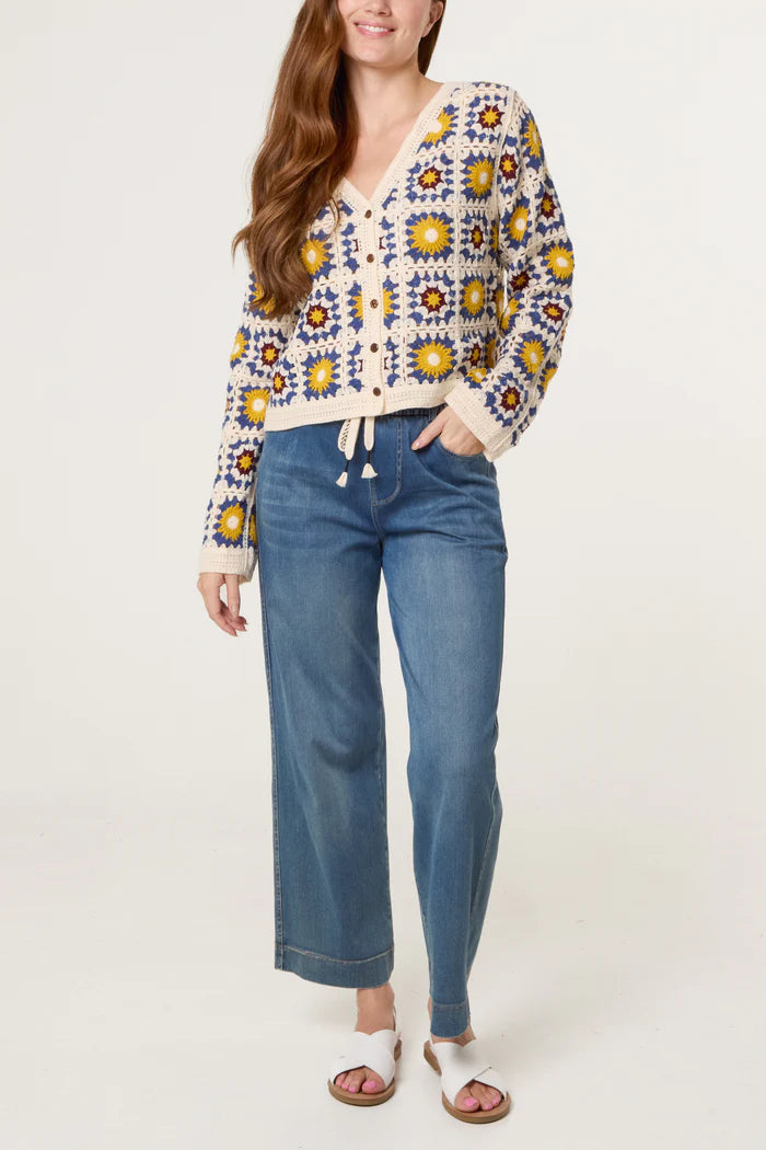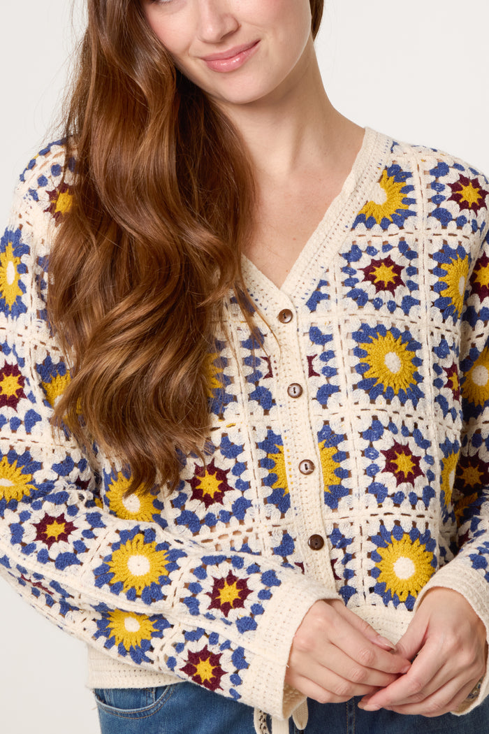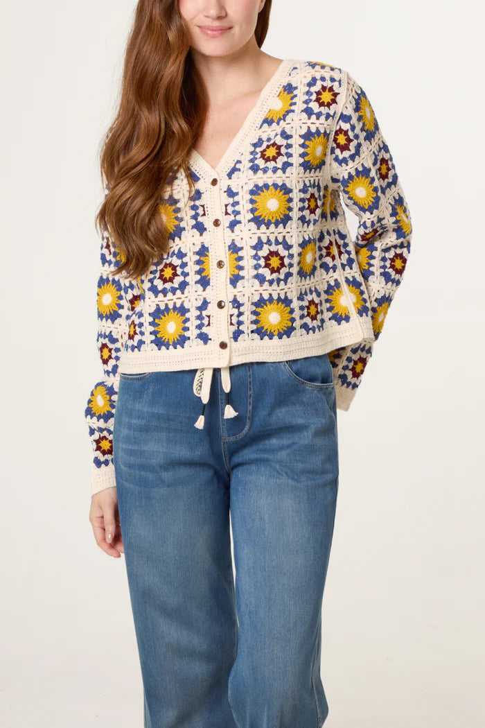 The distinctive sunflower design creates visual interest and texture, transforming a classic cardigan silhouette into a statement piece. This is knitwear with personality—perfect for those who appreciate unique, handcrafted details.
