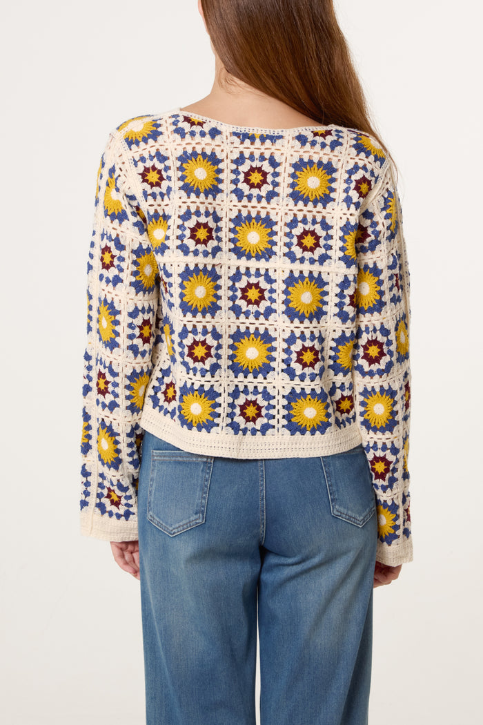 - Intricate sunflower crochet pattern throughout